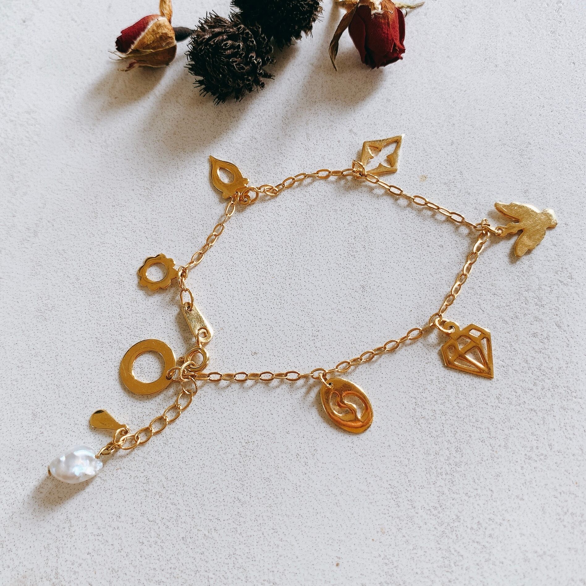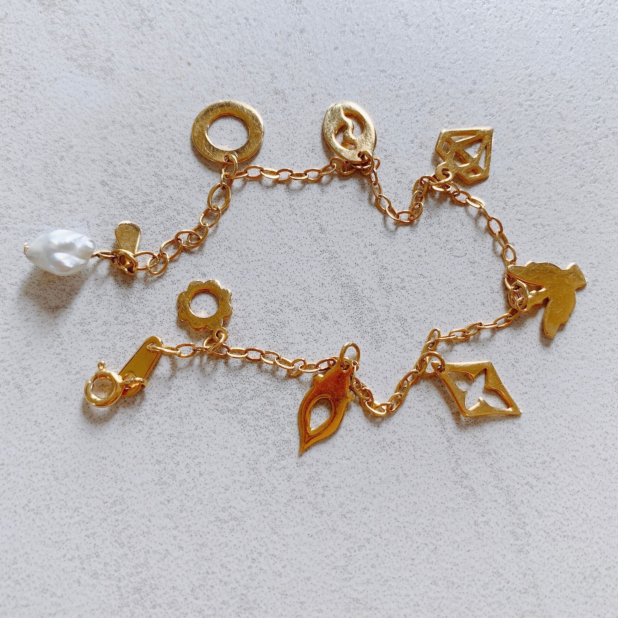 一粒ケシパール&チャームたくさん♡ゴールドカラーブレスレット【BSG-003】