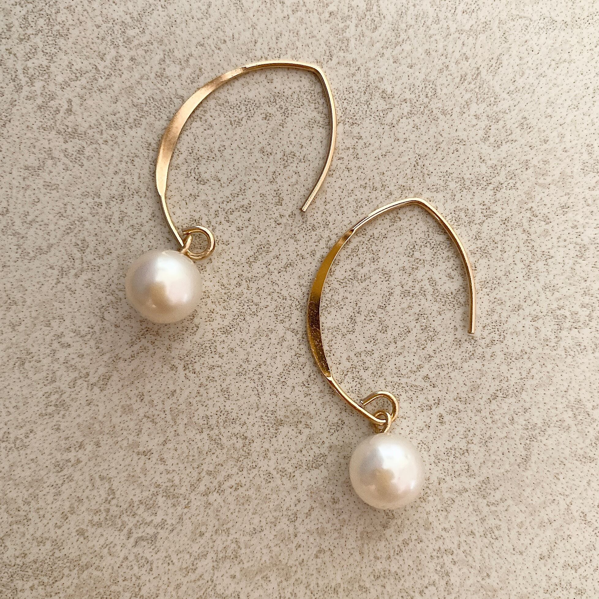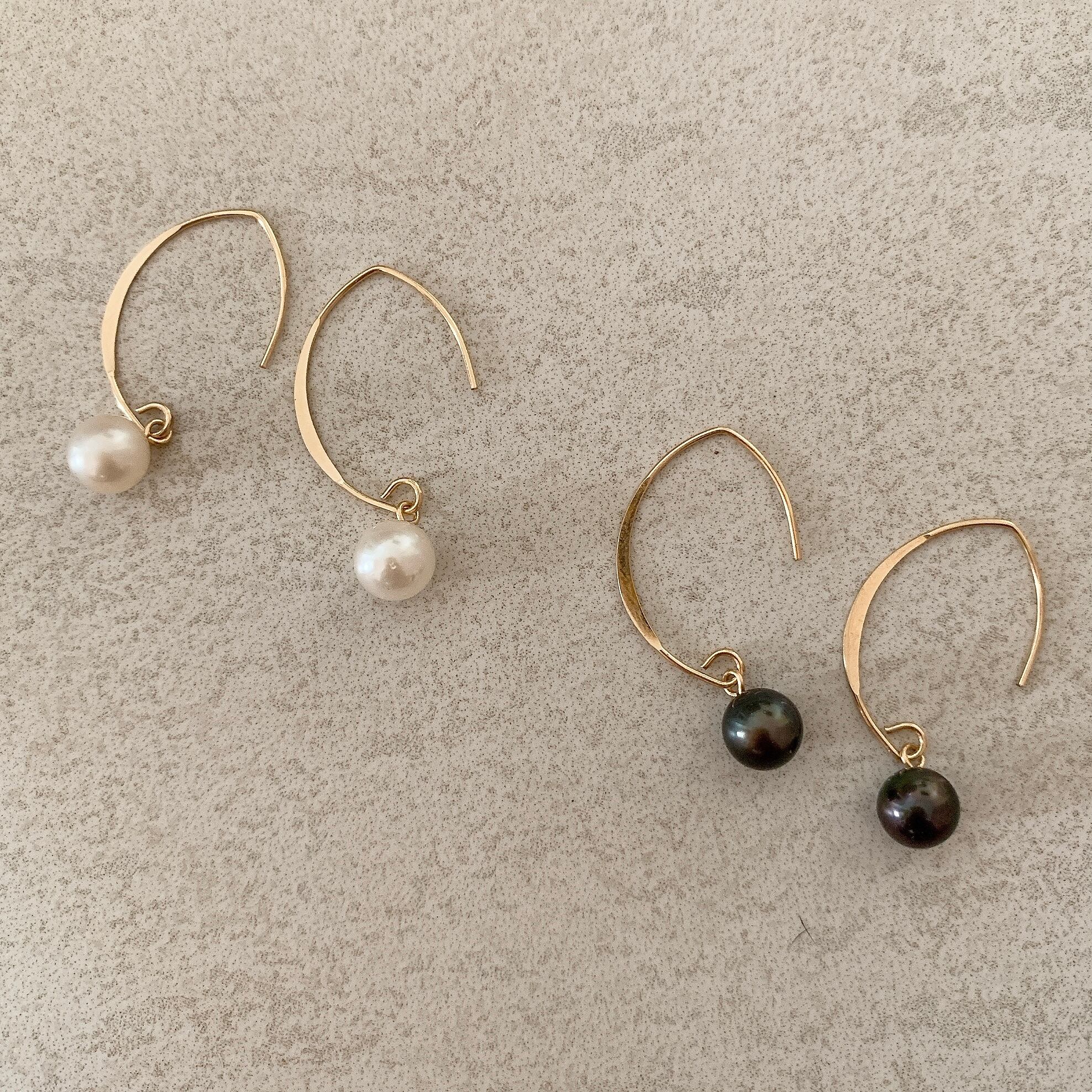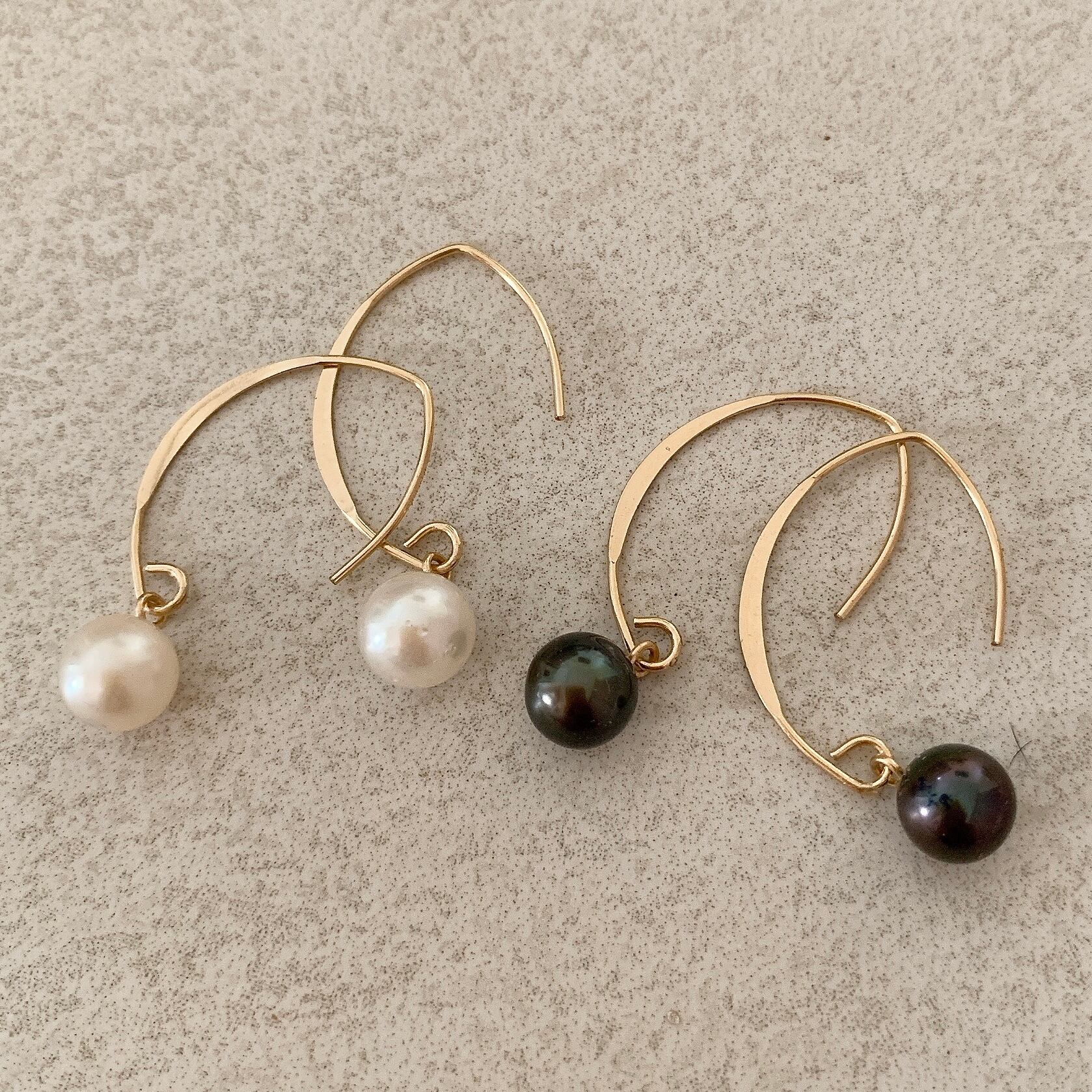 スタイリッシュなピアスにパールがゆらゆらぶら下がった
