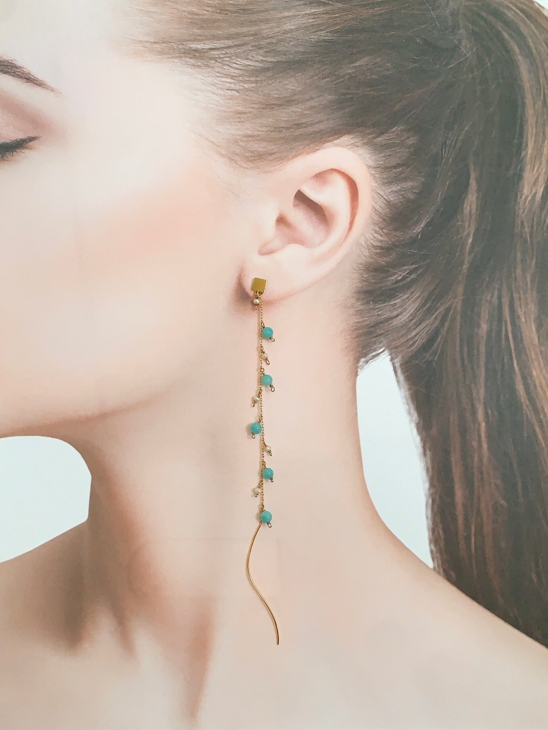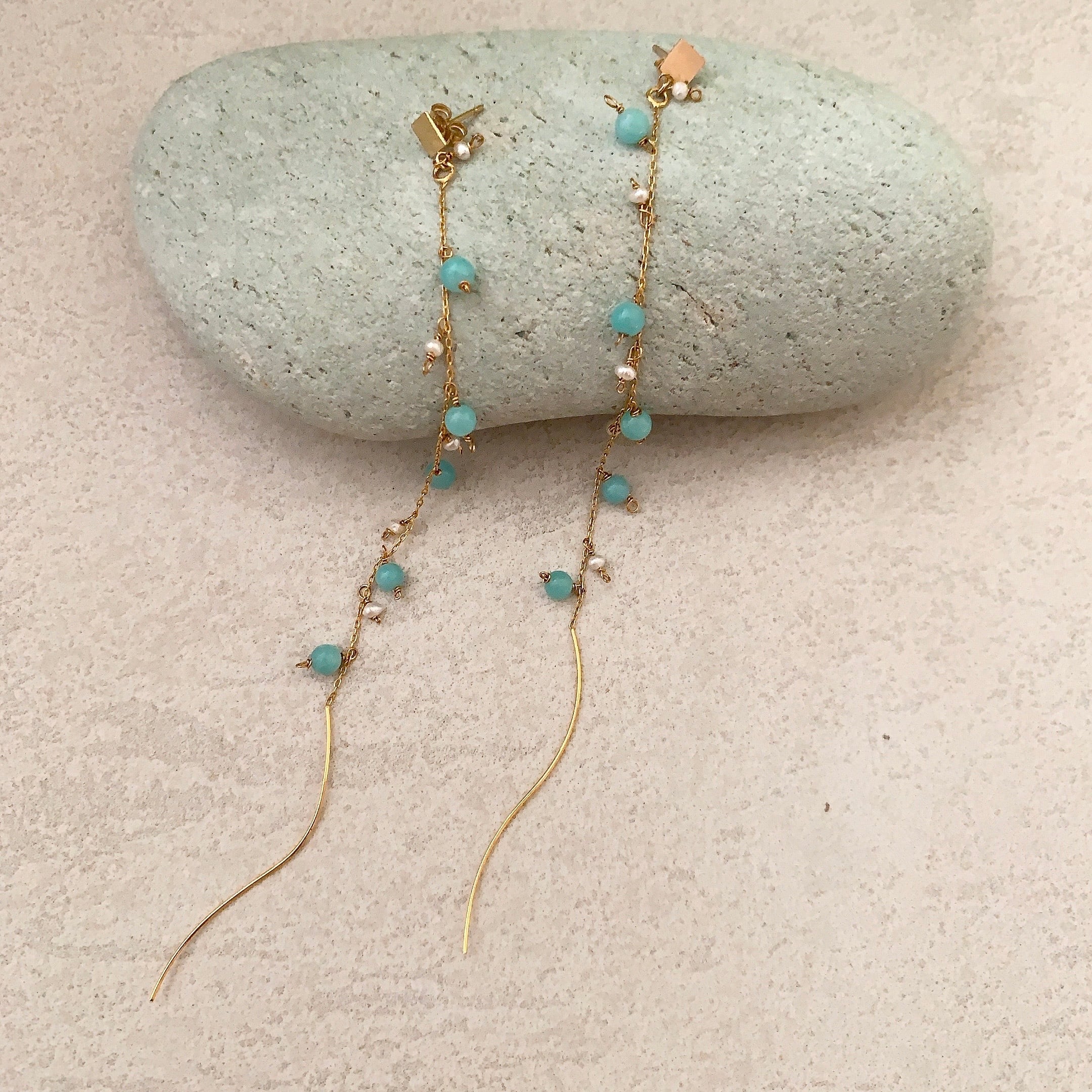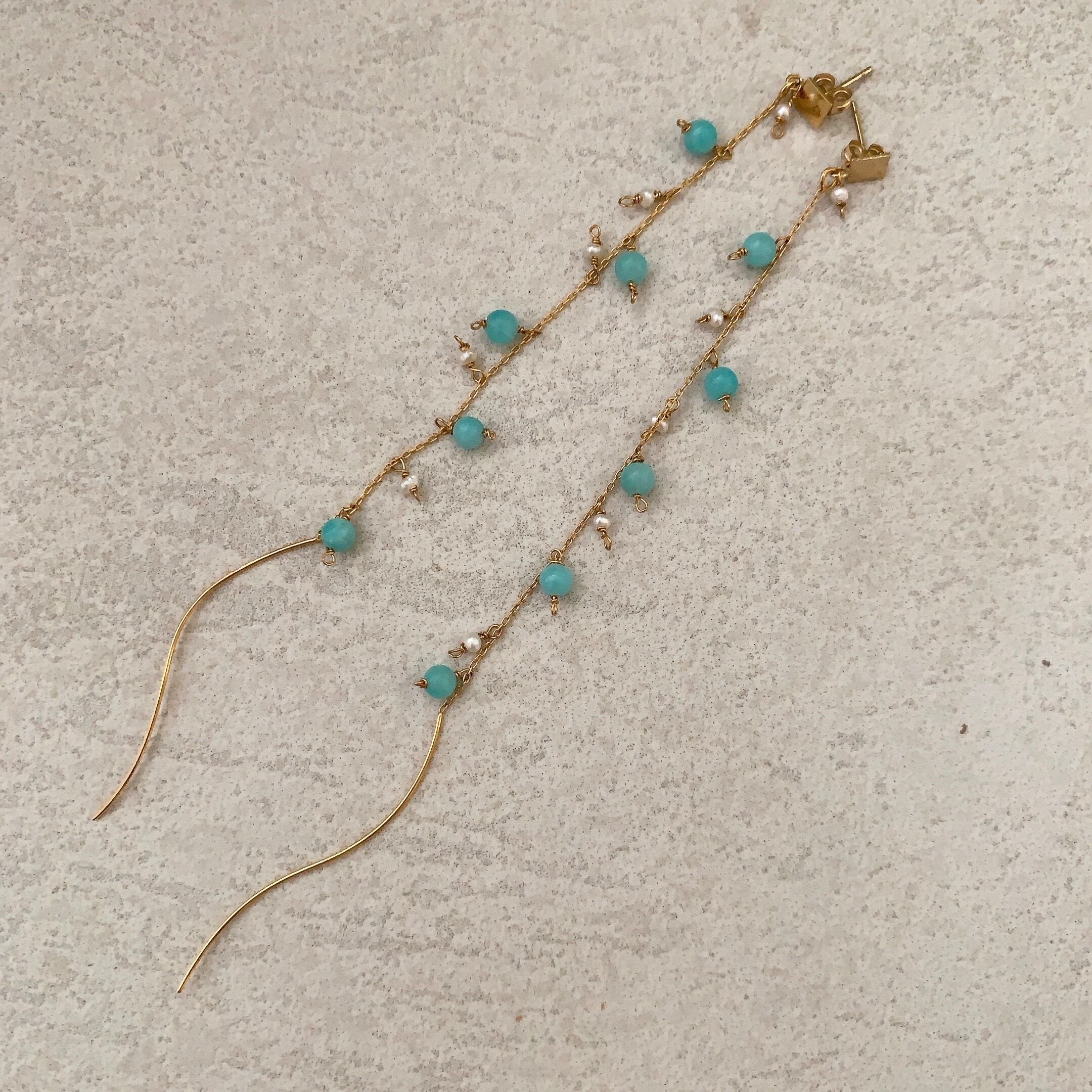 アマゾナイト+ベビーパールのロング13cmピアス【TPE-001】